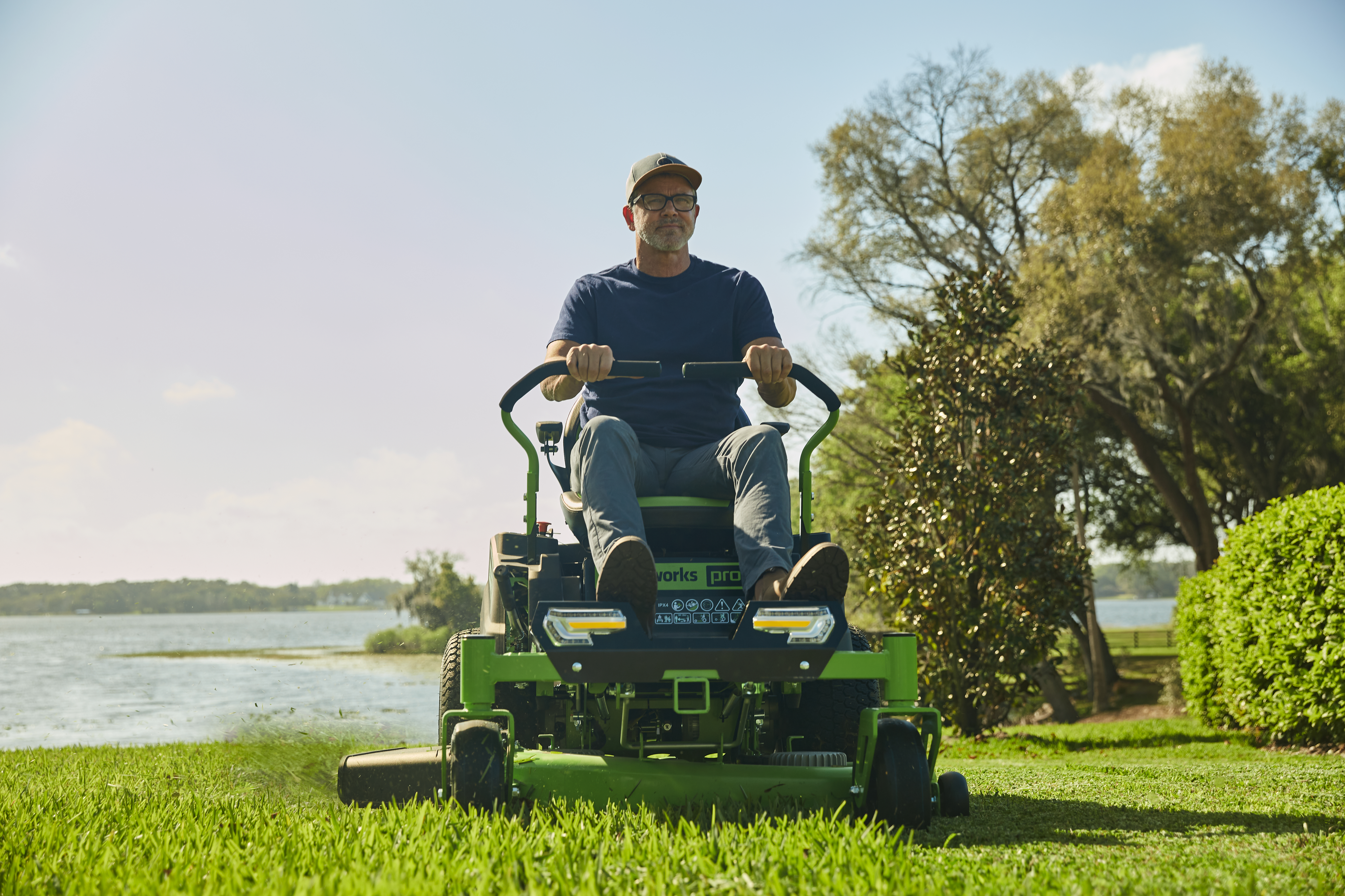 Man on a Greenworks lawnmower (Photo: Business Wire)